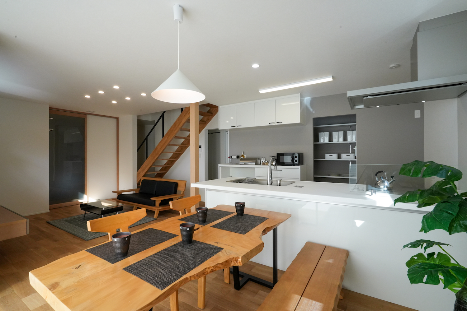 リビング階段をスケルトンにすることで、室内をより広く感じる設計の工夫をしています。